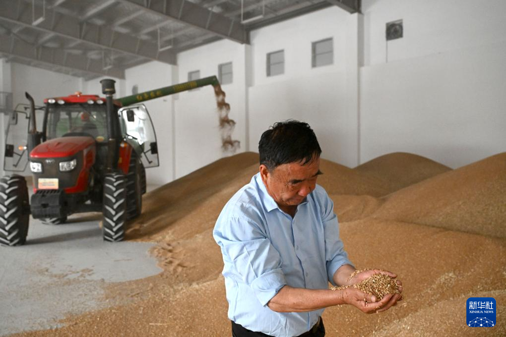 5月28日,徐淙祥在太和县淙祥农事服务中心察看收获的小麦。新华社记者 黄博涵 摄