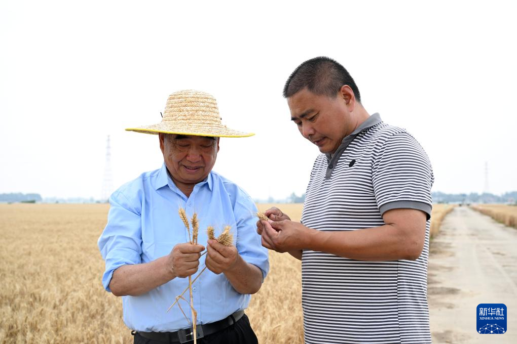 5月28日,徐淙祥(左)在阜阳市太和县旧县镇的田间和种粮大户交流小麦的成熟情况。新华社记者 黄博涵 摄